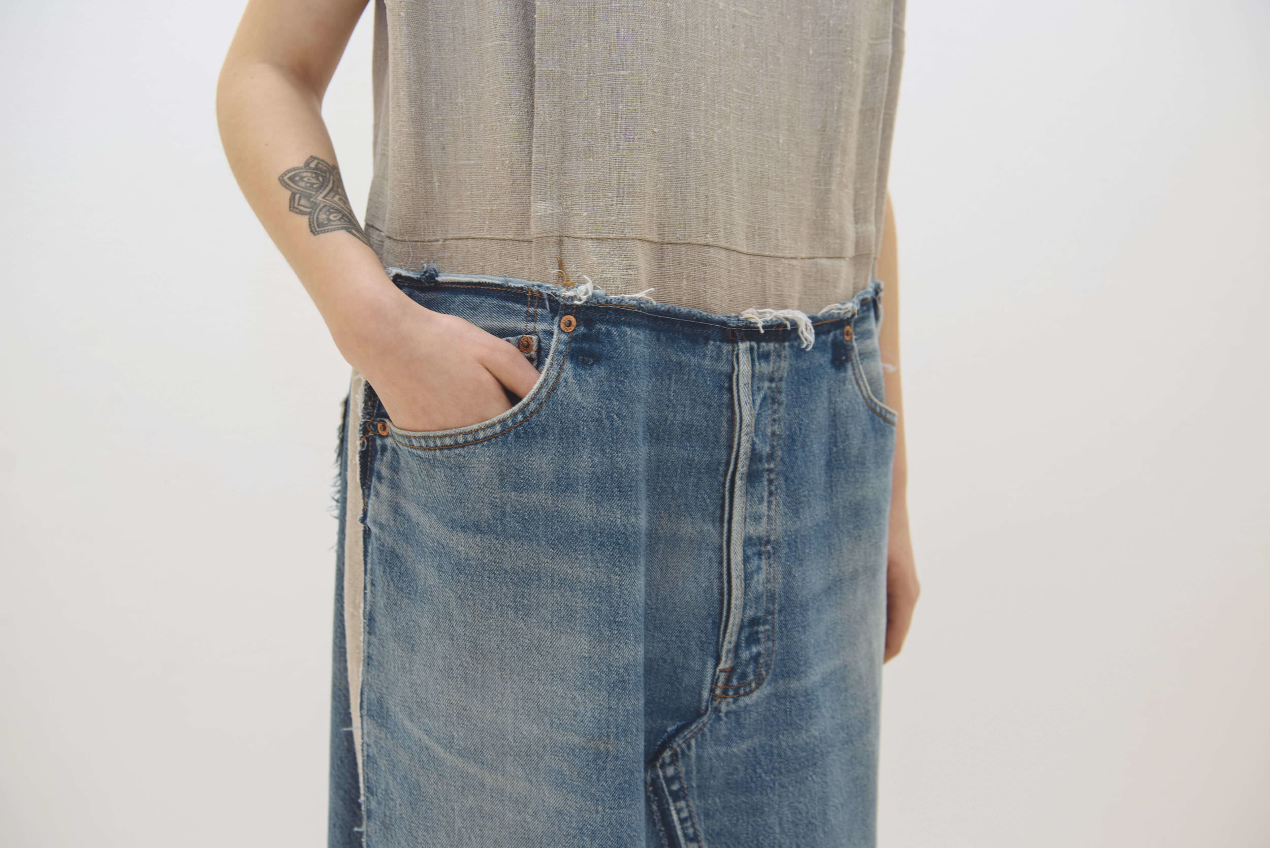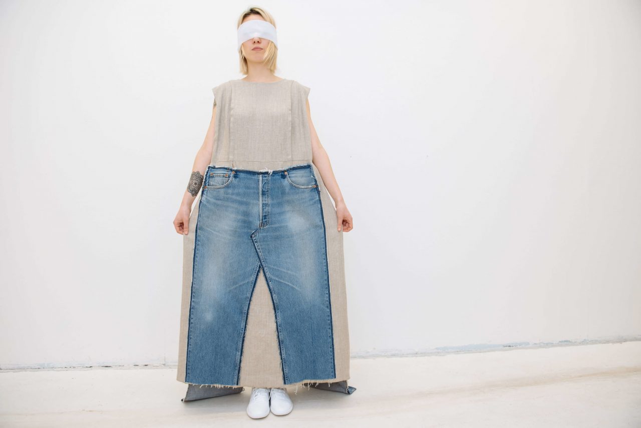 Oversized Unfinished Dress is based on the original Martin Margiela pattern from 2004. Materials: Belarusian linen, reworked Levi’s jeans.